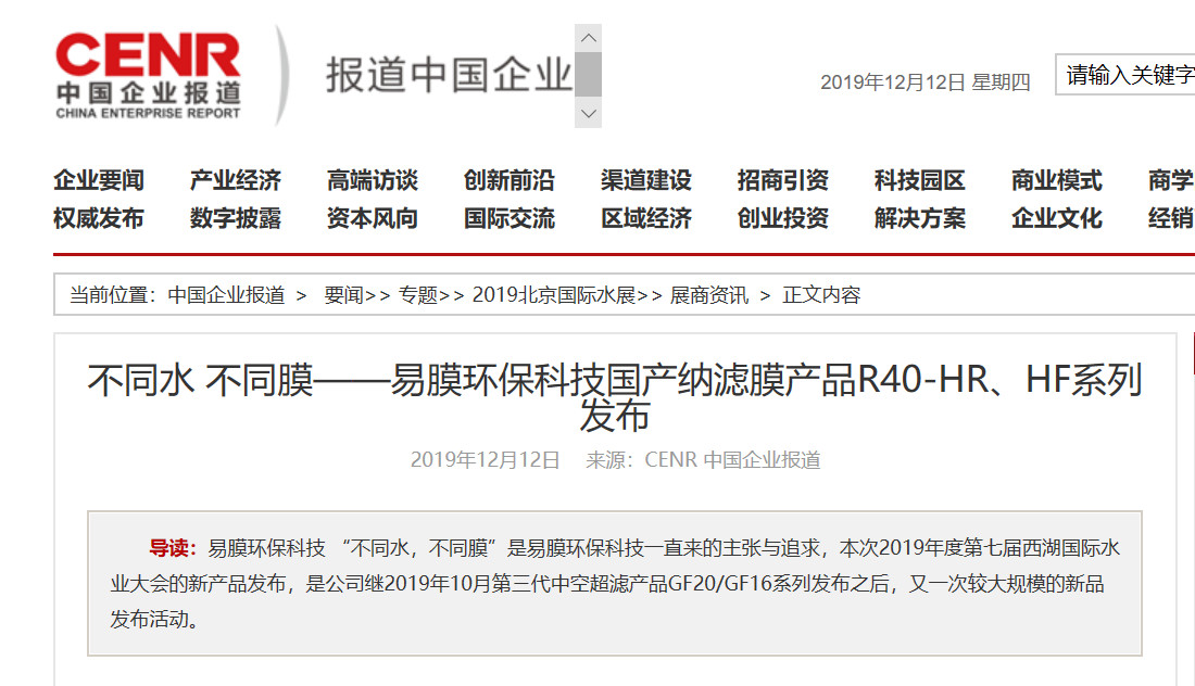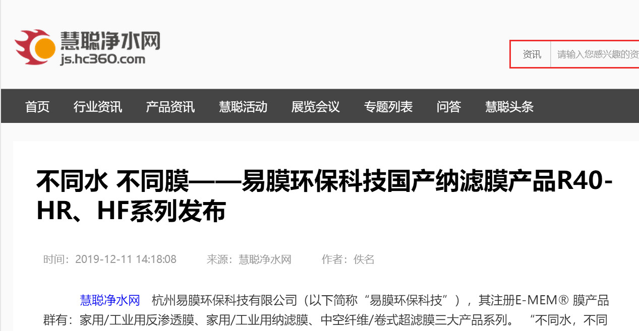 “不同水,不同膜”是易膜環(huán)保科技一直來的主張與追求,本次2019年度第七屆西湖國際水業(yè)大會的新產(chǎn)品發(fā)布,是公司繼2019年10月第三代中空超濾產(chǎn)品GF20/GF16系列發(fā)布之后,又一次較大規(guī)模的新品發(fā)布活動。